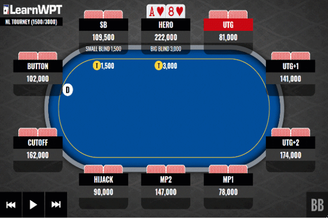 翻前:你在大盲位拿到了A♥8♥,MP1和按钮位玩家先后平跟溜入,小盲位弃牌,你过牌。