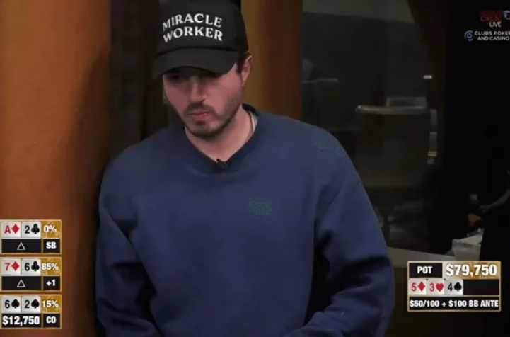 在上周的“Hustler Casino Live”直播中上演了罕见的一幕:在一个高达$80,000的底池中,三位玩家竟然在翻牌圈分别击中了不同的顺子。
