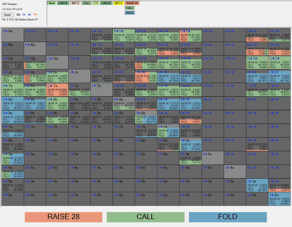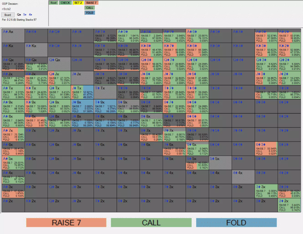 假设按钮玩家加注,你在大盲位置跟注。翻牌是Q♠5♦4♦,你过牌,按钮玩家持续下注。我们来看看PioSolver在这种场景中作为大盲玩家的屏幕截图: