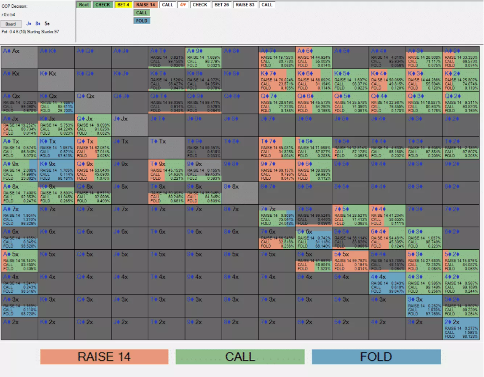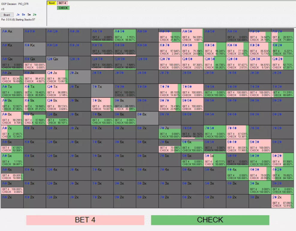 按钮玩家加注,你在大盲位置跟注。翻牌是J♦8♦5♠,你过牌,按钮玩家持续下注。我们在看看PioSolver在这种场合作为大盲玩家的屏幕截图: