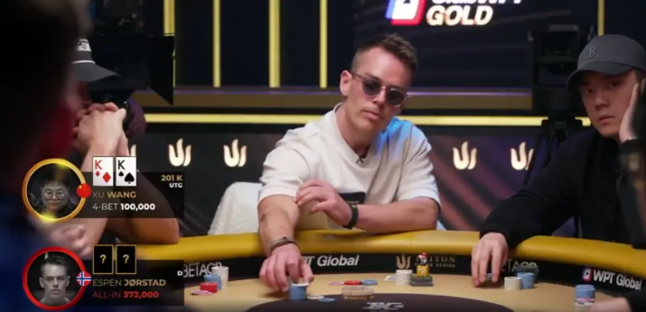 Wang 4bet到100,000,随后Jorstad迅速全下。Wang此时已经投入了约三分之一的筹码,还剩192,000。他看了一眼时间,然后仔细思考自己的选择。