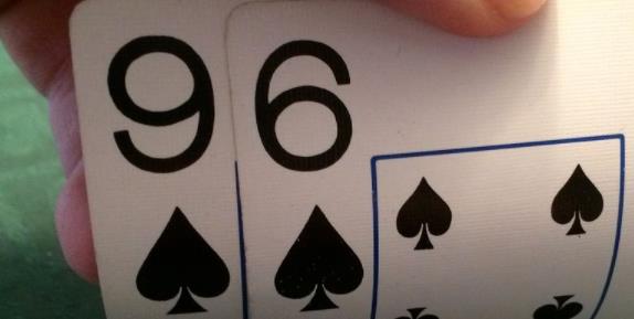 4、按钮玩家加注到2.5BB,小盲玩家弃牌,轮到你在大盲位置行动。你拿着同花96。你会怎么玩?