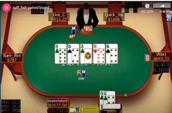 翻牌是Q♦4♥2♣。两人都过牌。转牌是9♥。Tuff_fish拿到了三条9,很得意的说:“哈,Empire,如果你进来,你就完蛋了。”