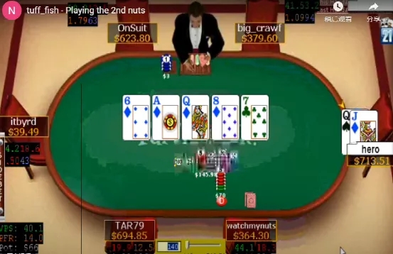 河牌是7♣。Tuff_fish仍然拿着第二坚果牌。他说:“如果他下注接近一个底池大小,我就弃掉这手牌。如果他没拿到K♦,他不会那么做。”