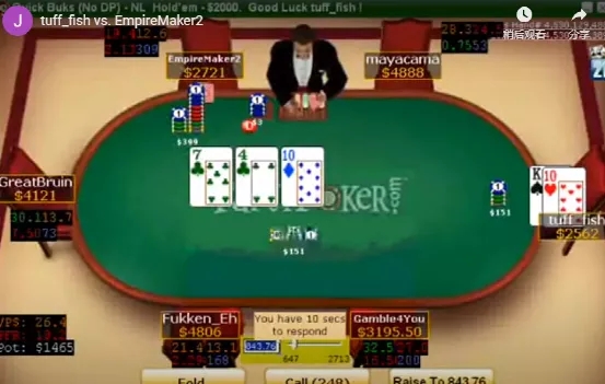 结果EmpireMaker2亮出了底牌Q♣J♣,Tuff_fish骂道:“你这个人渣。”