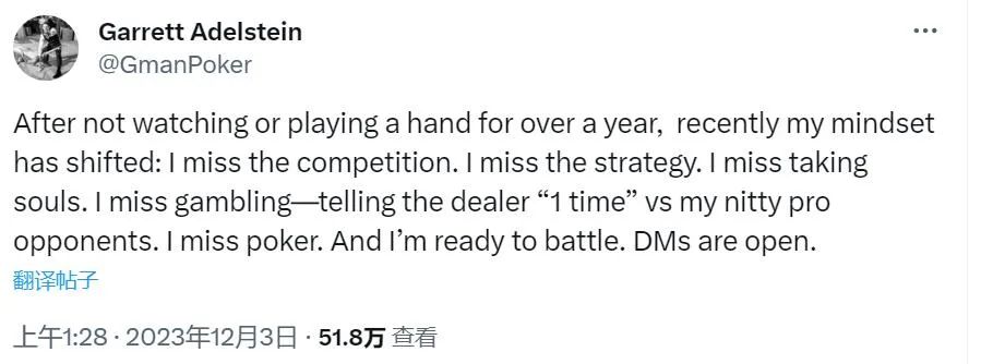 (翻译:“在一年多没有观看或者亲自打牌之后,最近我的心态发生了转变:我想念比赛,想念策略,想念碾压对手意志,想念博彩——想念告诉荷官‘发一次牌’和想念我那些打得很紧的对手。我已经准备好战斗了,私信开放喔。”)