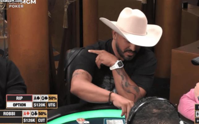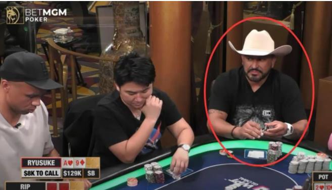 视频1:47:47处,RIP低下头看了大约5秒钟,然后他直接看向Robbi,这时这一手牌刚刚结束。牛仔帽可能是用来保护他在俯视时不被注意的。据推测,当他往下看时,可能是麦克风的红绿灯或其他方式向他发出信号。