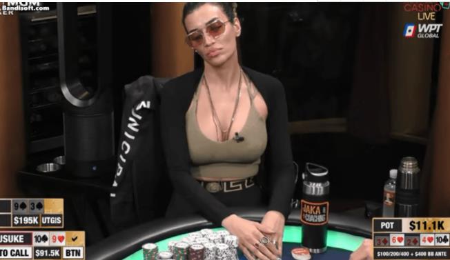 在上面这手牌中,RIP和Robbi都拿到了AQ。然后在视频2:01:28时,RIP发出“咦”的怪声,然后头向右倾,左手食指搭在右肩上,似乎在用身体语言向坐在对面的Robbi发出信号,告诉她自己拿到了大牌,希望她弃牌。Robbi可能是这个骗局中的主要人物,他们希望她的筹码尽可能多,会给她一些信号,告诉她怎样玩更好。