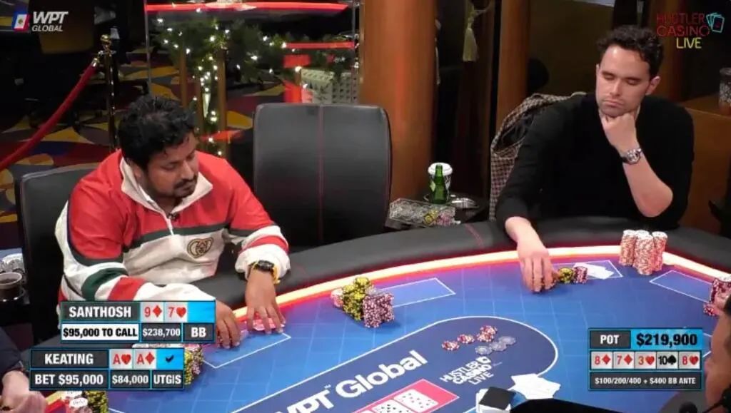 前面玩家弃牌到大盲位的Santosh Suvarna,他拿着9♦7♥跟注。Straddle位置的Alan Keating拿到了一手A♥A♦,大幅加注到$12,000。Suvarna跟注。底池大小:$24,900。