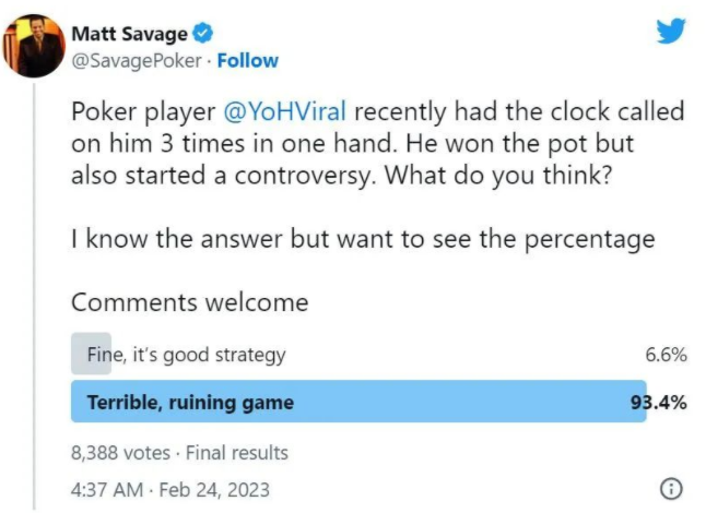 WPT巡回赛执行总监Matt Savage在Twitter上发布了一项民意调查,超过93%的玩家表示Guilbert的行为正在毁掉比赛。