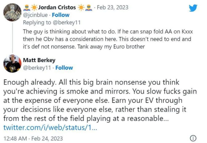 这个说法很快遭到另一位美国牌手Matt Berkey的反击,他指责Cristos和Guilbert一样糟糕,都是在牌桌上过度长考浪费时间的人。