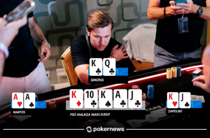 Zapolski率先下注42,000,Simons加注至约95,000(后手还有约60,000筹码),Martos随即全下约340,000,覆盖两位对手。