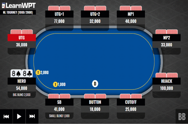翻前,一位拥有77000筹码的紧手玩家在UTG+1位置率先加注到10000,其他玩家全部弃牌,你在大盲位置拿着8♠8♣,手头还有54000筹码,现在到你行动。