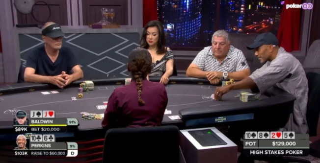 • Baldwin在Straddle投入$800。按钮位的Perkins用T♣6♣(T代表10)率先加注到$3,000 美元。Baldwin拿着J♠J♥ 3bet到$9,000。大多数人在这种情况下会选择弃牌,但有位置优势的Perkins做了一个松的跟注。底池大小:$19,000。