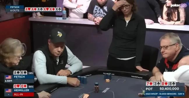Heimiller赢得了50,400,000的巨额底池,成为新的筹码领先者,而Fetsch则徘徊在出局边缘。