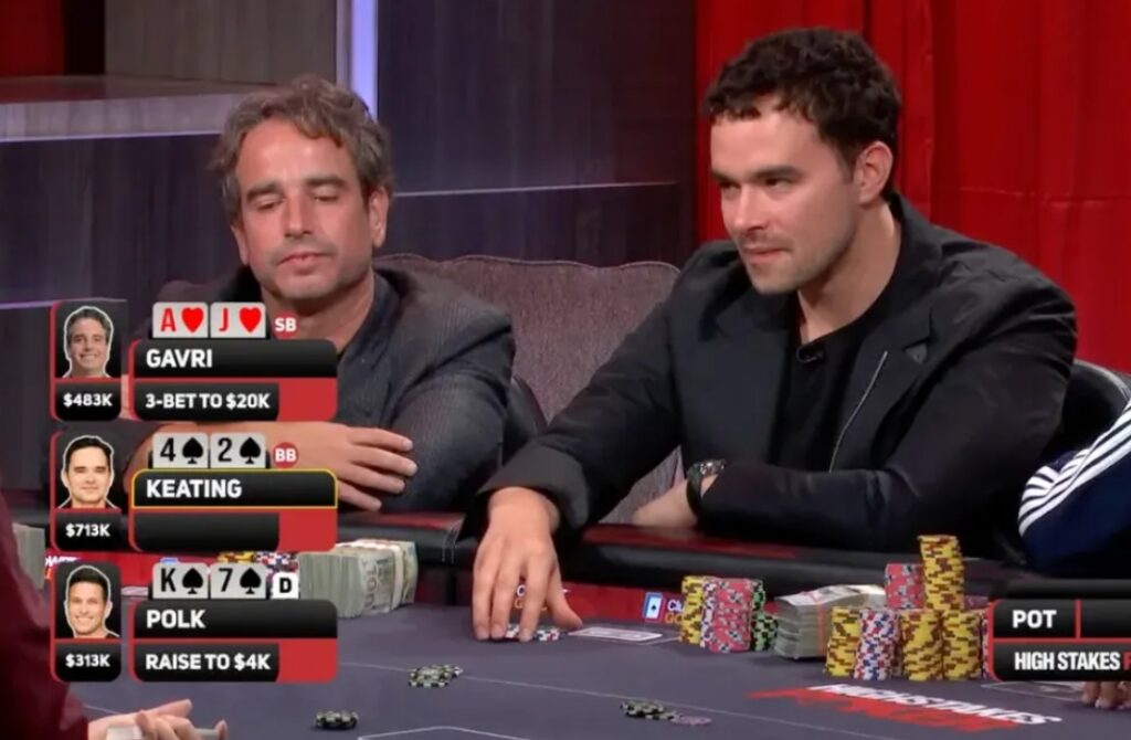 Polk在按钮位用K♠7♠率先开池加注到$4,000。小盲位的Gavri拿着A♥J♥ 3bet到$20,000。