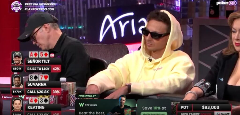 上周末,《High Stakes Poker》节目在PokerGO上进行了两天的特别直播,刚好见证了这位“不爱弃牌”的流量担当,从第一天用4♠2♠硬刚Doug Polk的三连下注,赢下65.7万美元底池,到第二天拿着4♦3♠灾难级诈唬,输掉129.5万美元底池的戏剧转折。