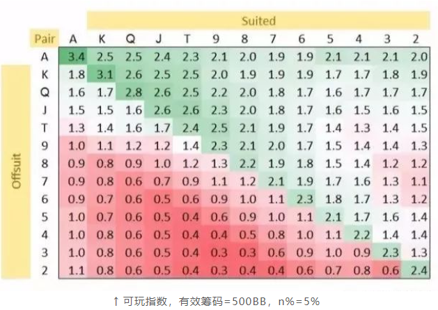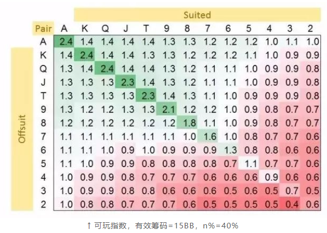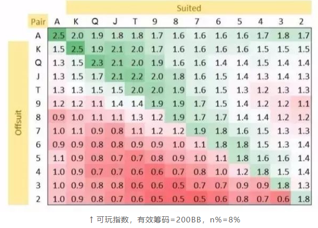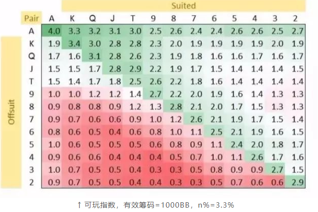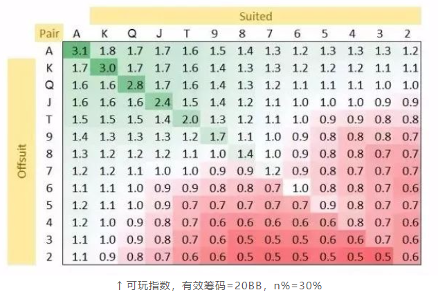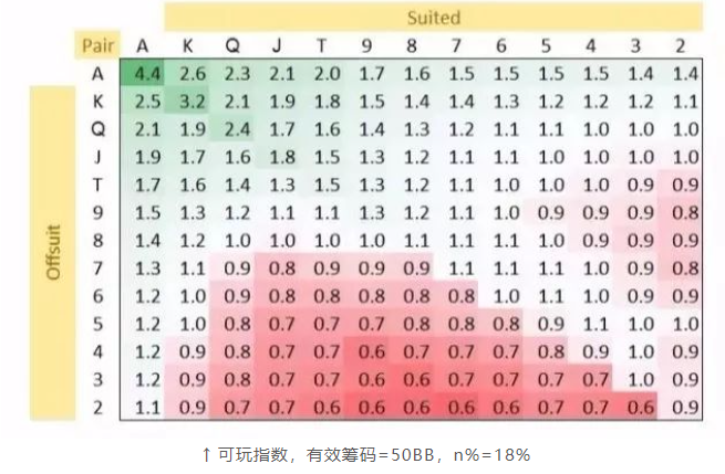 定义:可玩指数是指某一起手牌在特定筹码深度时“应该玩”的程度。可玩指数越高,越应该玩;可玩指数越低,越应该抛弃。