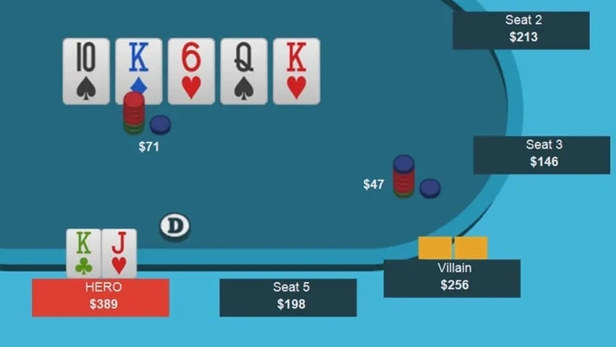 在6人桌游戏中,KJo在任何位置都是有利可图的率先加注牌;但在9人桌游戏中,它应该在前三个位置(UTG,UTG+1和UTG+2)弃牌。