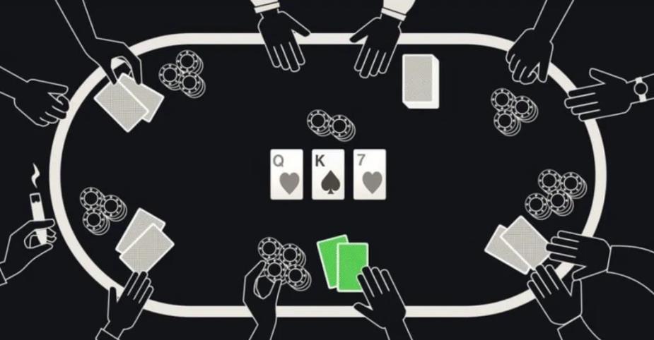 但是我们从大盲位的角度来看看他河牌的决策。同花牌有可能成了,大盲位手里有两张K。牌面是A♣9♣T♠Q♠J♣,大盲位指望对手会用哪些没在转牌全下的牌跟注呢?