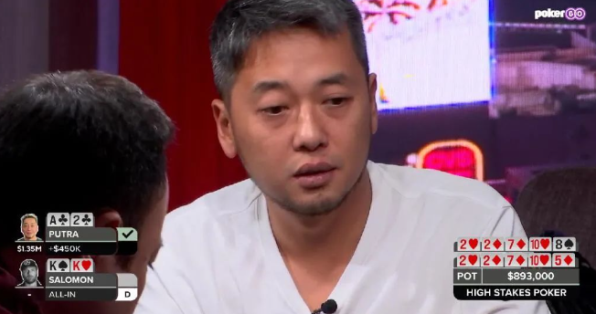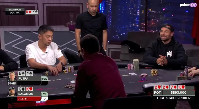两人同意发两次。Salomon只有两个outs:K♣和K♥,但最终发出的分别是8♠和5♦,Putra赢下了这个 $893,000的巨额底池。