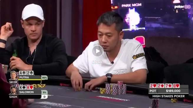 此时Putra的胜率高达95%,而两次发牌都没能击中Salomon为数不多的补牌。