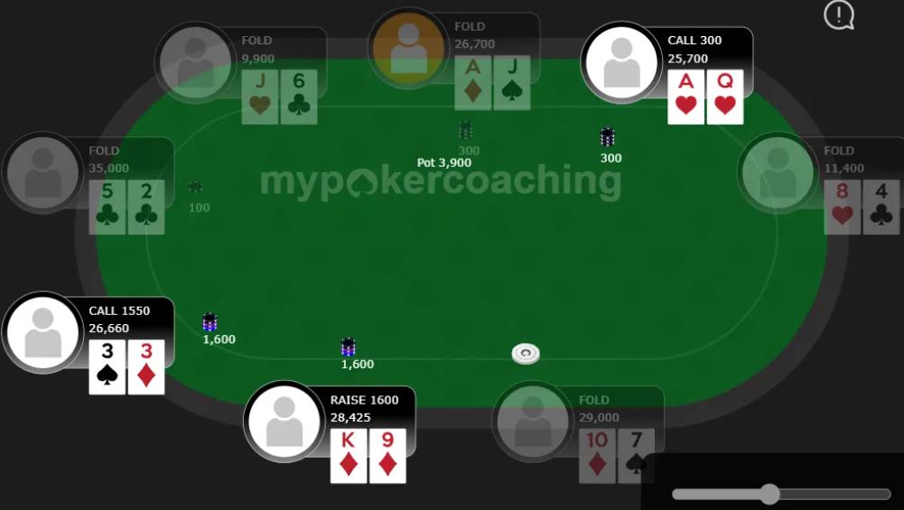 后面玩家弃牌到小盲位的Alex,他看了眼手中的K♦9♦,挤压加注到$1,600。