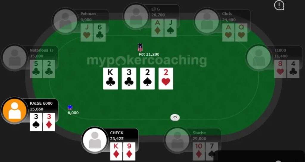 3、转牌圈行动及分析转牌:2♥。公共牌现在是K♣3♣2♠2♥。