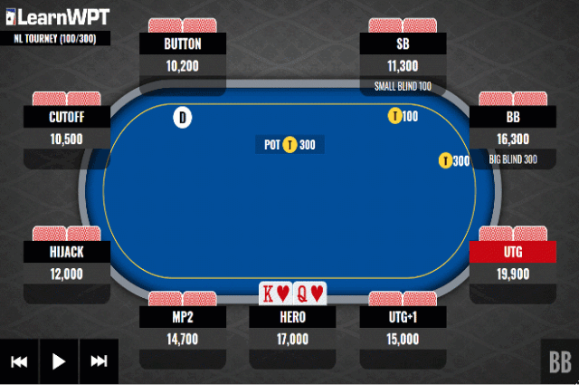 如果我们对UTG+1玩家的持续下注全压,对手将可能放弃一手不错胜率的牌。拿下一个无需竞争的底池,使筹码量增加50%,对我们来说是一个极好的结果。