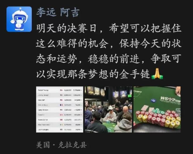 而在昨天Day2比赛结束后,李远就在朋友圈表达了对这条金手链的期待。