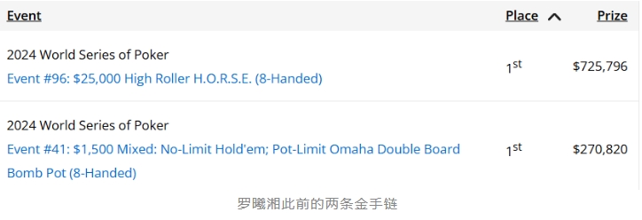 在刚刚结束的2025年WSOP第24项赛事:$1,500 Pot-Limit Omaha Double Board Bomb Pot(底池限注奥马哈双牌面炸弹底池赛)中,来自中国广东潮州的罗曦湘(外号“超黑”),战胜美国选手Robert Klein夺得冠军,揽获奖金290,400美元!这是国人今夏在WSOP赛场上的首条金手链,这也是他个人的第3条金手链。