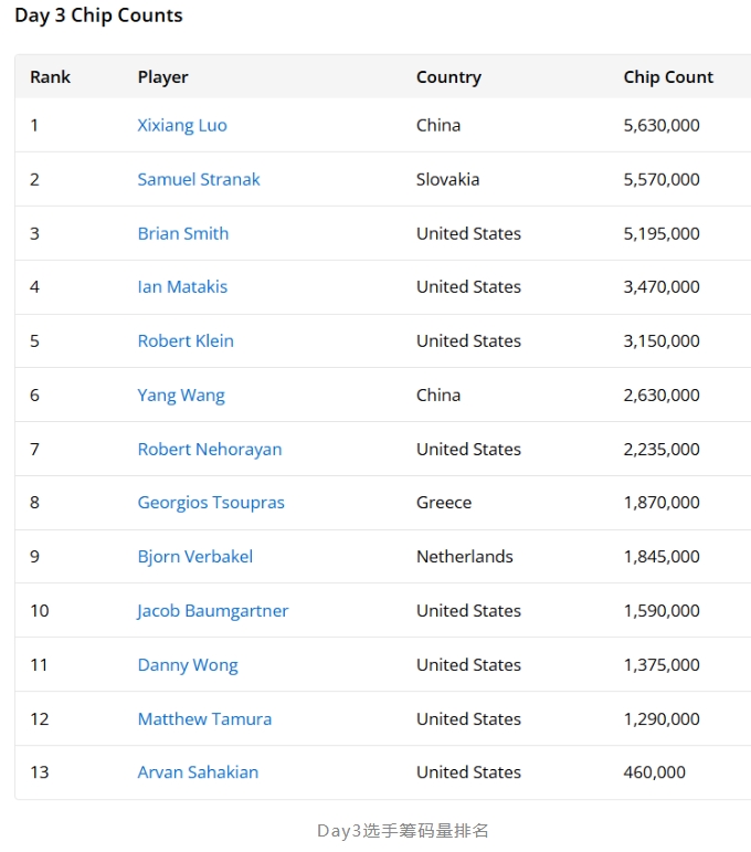 在本场比赛的1452名参赛选手中,仅剩最后13人进入Day3的角逐,唯一拥有两条金手链的罗曦湘是其中的筹码领先者。