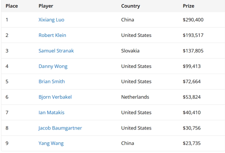 在进入单挑时,罗曦湘以约3:2的筹码优势领先于Robert Klein。此后尽管Klein曾努力将筹码几乎追平,但始终还是被罗曦湘所压制,最终在单挑持续了两个多小时后,Klein不敌罗曦湘,获得第二名,奖金$193,517。