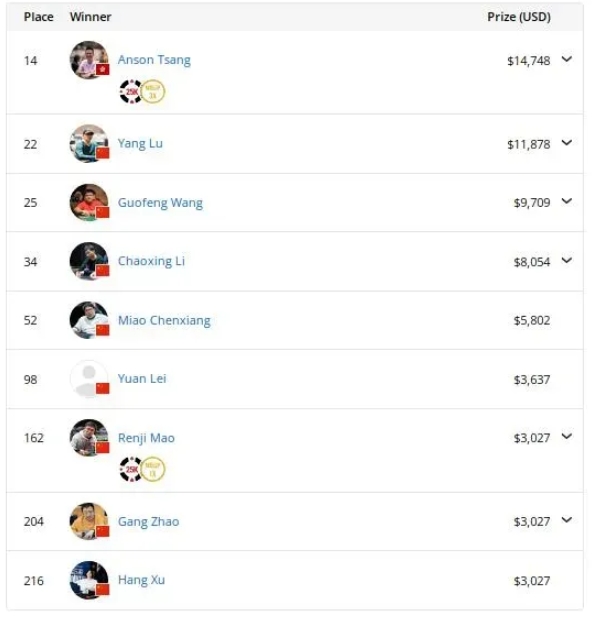 此外还有多位中国及中国香港选手在本场比赛收获奖金:
