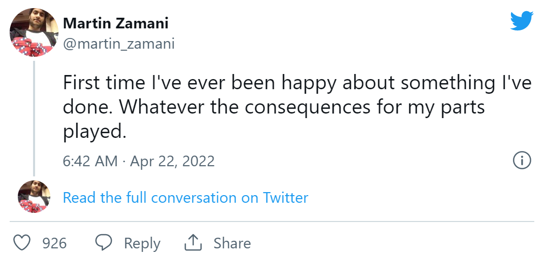 采访结束后,Zamani如释重负,表示对自己的所言并不后悔,并为此感到高兴。