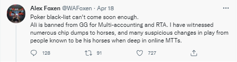 Alex Foxen:扑克黑名单来得还不够快。Ali Imsirovic因多账户和RTA被GG列入黑名单。我无数次目睹他将筹码转给同伙,并且在进入线上MTT后期时,那些已知是他同伙的人在比赛中做出了许多可疑的行动。