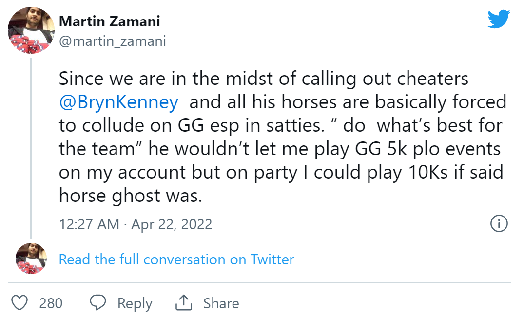 Pokernews的记者联系了一位过去曾被Kenney吊打的玩家,他在不透露姓名的情况下确认Zamani的指控是真的。媒体也联系了Kenney,但截至记者发稿时,没有收到任何回应。接下来事件会如何发展,我们拭目以待。
