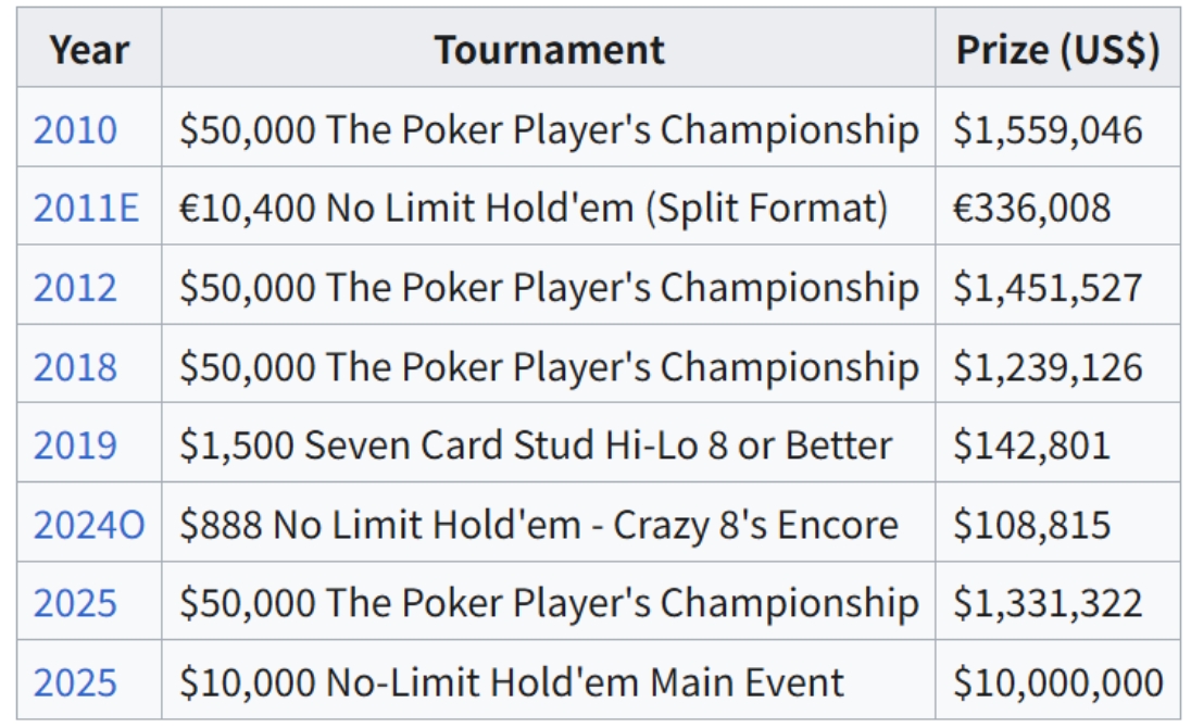 2025年WSOP主赛最后比赛日开赛不到1个小时,掌控了全场76%筹码的美国玩家Michael Mizrachi,只用了20手牌就迅速淘汰了最后3位对手,毫无悬念地夺得最具份量的主赛冠军头衔和10,000,000美元奖金,并获得他个人的第8条金手链。