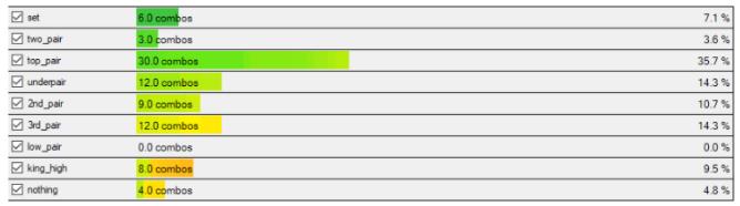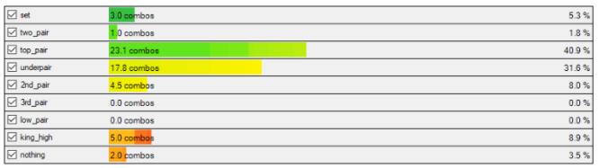 这个范围中12.5%的部分是K高或更差牌。余下部分(87.5%)至少是第二对子,而这些牌有着不错的胜率。