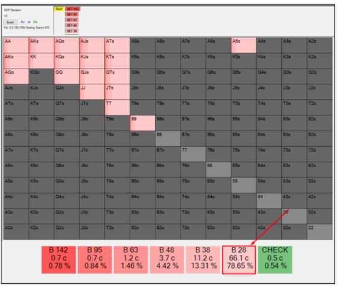 底池是190,PioSolver软件选择绝大多数时候下注28。在实战中,我会用整个范围做这种尺度的下注来简化这种策略。