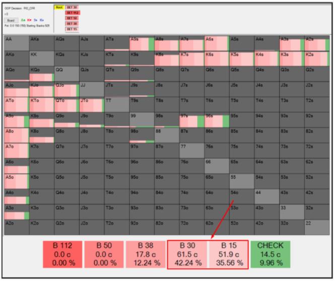 为了看出哪种下注尺度使用最频繁,我给了PioSolver软件7种不同的尺度选择。我们来看看: