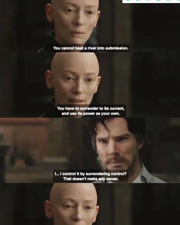 电影”Doctor Strange(奇异博士)”中大师说:You can’t beat a river into submission(屈服). You have to surrender(臣服) to it. You have to give up control to gain it.