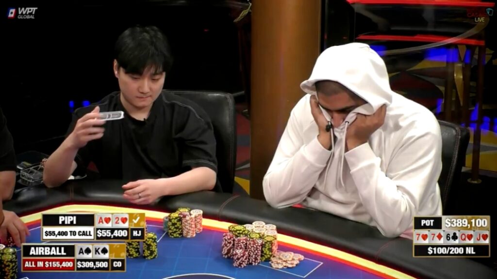 最终,Pipi认定对手拿到了葫芦,忍痛弃掉了手中的坚果同花,拱手让出这手总额$389,100的巨型底池。诈唬得逞的Airball立刻将底牌拍在桌上,Pipi气得一把推翻了Airball面前叠好的筹码。