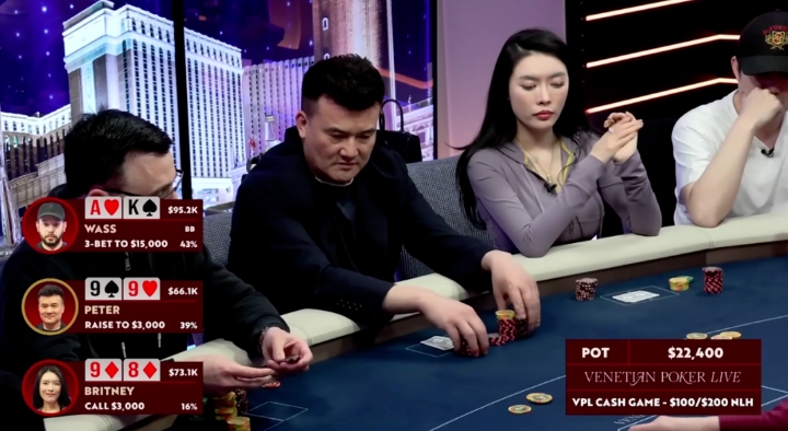 今天这手牌来自一档新加入直播扑克战场的节目:Venetian Poker Live。牌局的主角是最近人气大涨的嘉宾Peter Wang。尽管他不像其他老将那样在扑克直播圈已混迹多年,但凭借一次次孤注一掷的无畏全下,他敢打敢拼的打法赢得了不少粉丝的喜爱,也让他成为每一场直播难以忽视的存在。