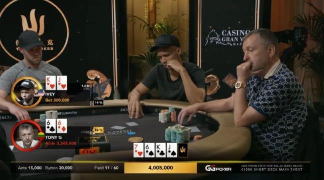 转牌J♠,这让Ivey的牌力提升为顶两对,现在他选择了一个非常大的下注量300,000,相当于底池大小的83%,Tony G直接全下,他的筹码量多于Ivey和Chidwick。