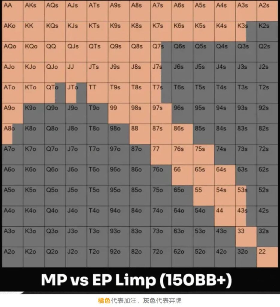 以下是Darren Elias对于150bb筹码深度下,在中间位置对抗前面位置的平跟溜入弱玩家的剥削范围。