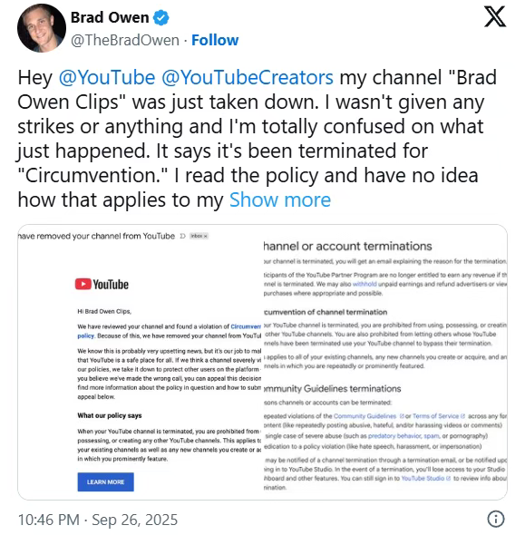 然而,这一切差点毁于一旦。他名下的其中一个子频道“Brad Owen Clips” 突然收到下架通知,理由是涉嫌违反YouTube规则——据推测可能与平台对赌博推广的准则相关。