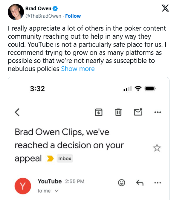 这意味着,一个博主耕耘多年积累的粉丝、内容和品牌,可能会在一夜之间被平台“清零”,并且几乎没有申诉途径。而这正是Brad Owen——一位可以说是史上最受欢迎的扑克视频博主,本周差点遭遇的Bad beat。