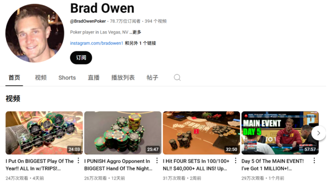 作为职业牌手,Brad Owen的现场锦标赛收入超过120万美元,但真正让他成名的,是他在常规局中的表现,以及近十年来在YouTube上持续发布的牌局Vlog和手牌分析。