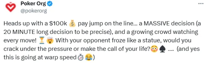 上一个在锦标赛中被镜头记录下的超长考,或许是在2022年WSOP主赛决赛桌上的一幕——当时的选手花了18分钟才做出决定。